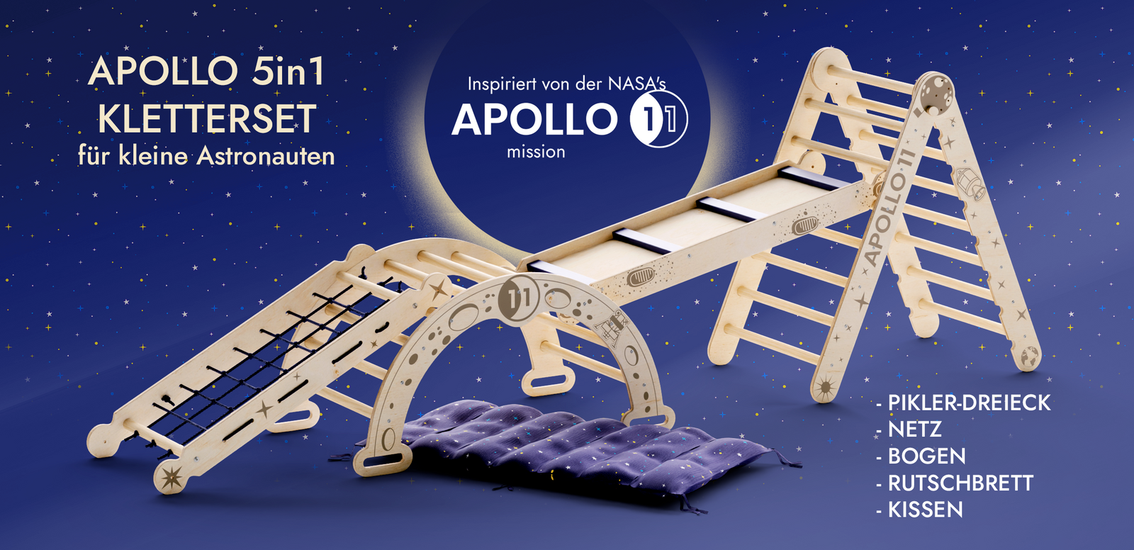 Das Apollo 5-in-1 Kletterset ist der persönliche Weltraumbahnhof Ihres Kindes, wo jede Bewegung eine Mission, jedes Spiel eine Entdeckung und jedes Lachen ein Signal von der Sternenstation ist. Mit Sorgfalt, Inspiration und Glauben an große kleine Träume geschaffen.